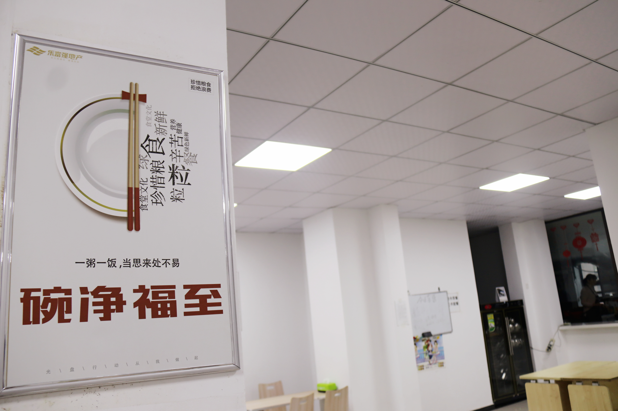 食堂在醒目位置張貼擺放宣傳標識,一進食堂就看到墻上的‘光盤行動’標語,積極營造浪費可恥、節約為榮的氛圍,時刻提醒員工用餐按需、合理取餐。