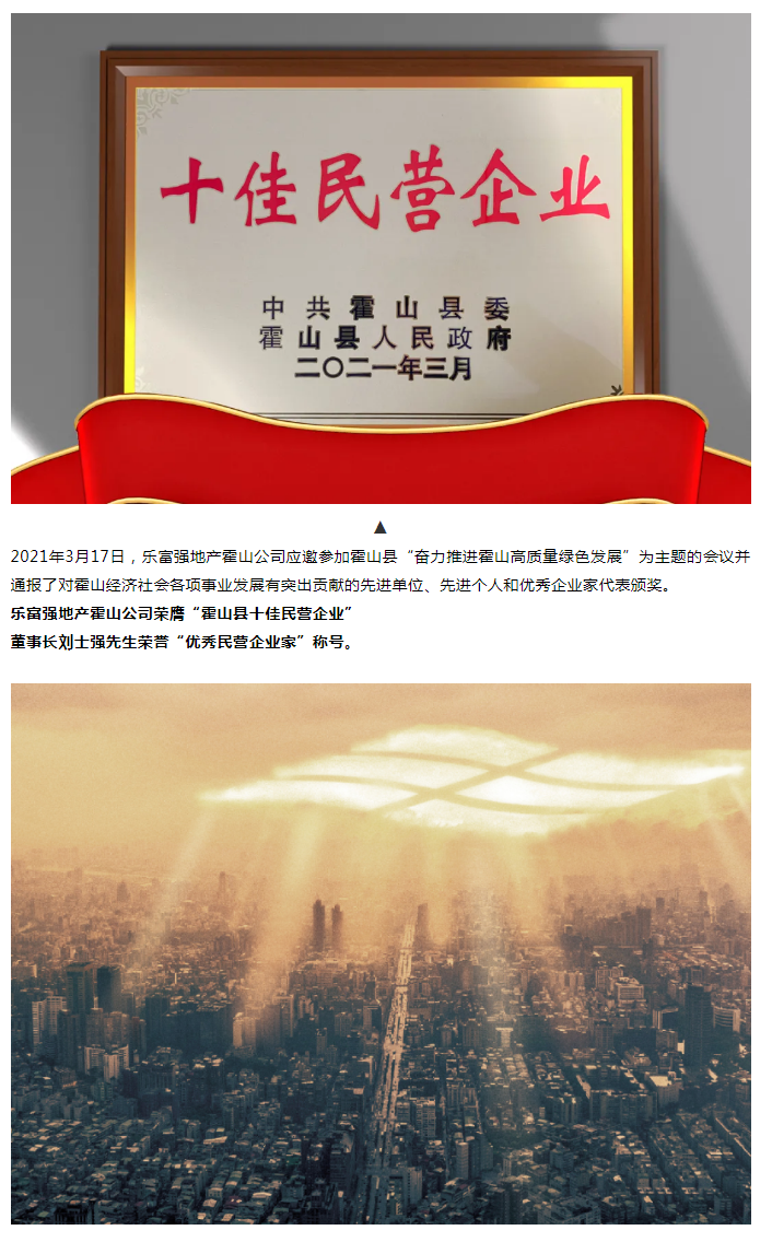喜報|樂富強地產(chǎn)霍山公司榮膺“霍山縣十佳民營企業(yè)”